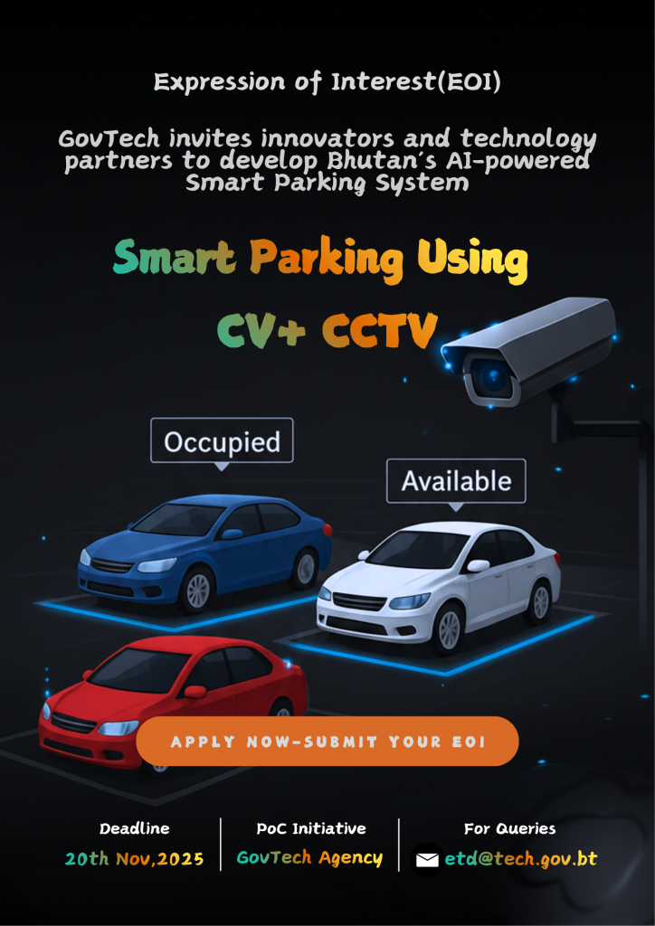 The GovTech Agency is piloting an AI and Computer Vision (CV) Proof of Concept to improve urban parking and traffic management. The initiative aims to use AI-powered CCTV systems to detect parking availability, identify illegal parking, and monitor traffic flow in real time. This effort supports Bhutan’s Smart City and Digital Transformation goals for efficient and citizen-centric urban services.